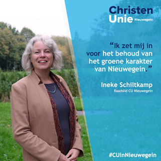 partijlid op de lijst van de ChristenUnie Nieuwegein is Ineke Schiltkamp. Sinds 2006 actief in de gemeenteraad van Nieuwegein en een groot voorstander van het behoud van al het mooie groen in